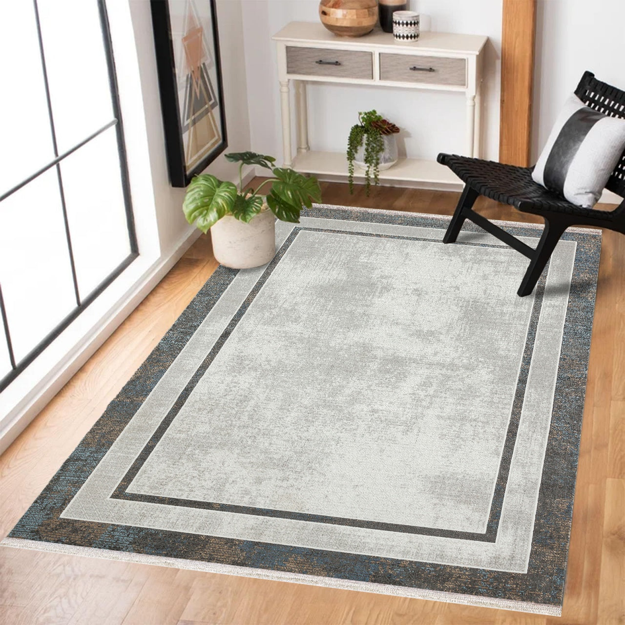 Gri Çerçeveli Modern Etnik Desenli Halı