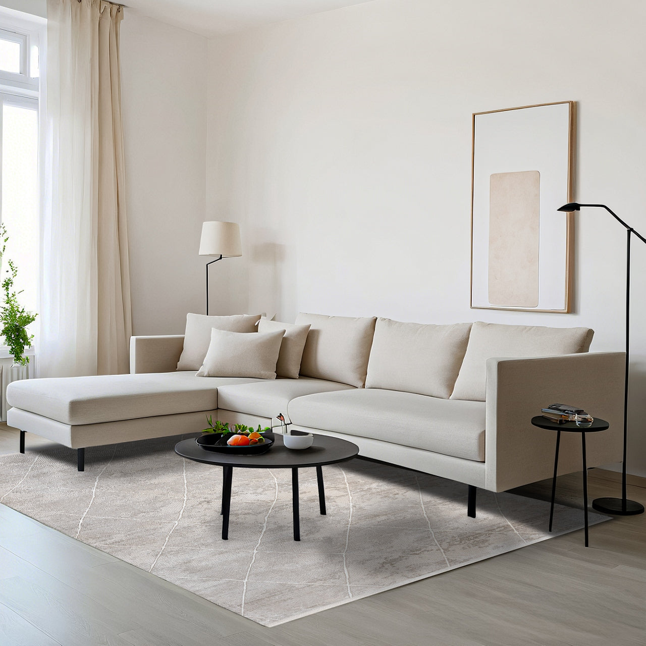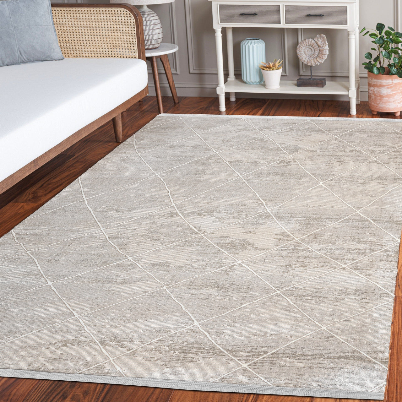 Sueda Bej Geometrik Mikrofiber Polyester Makine Alan Halısı
