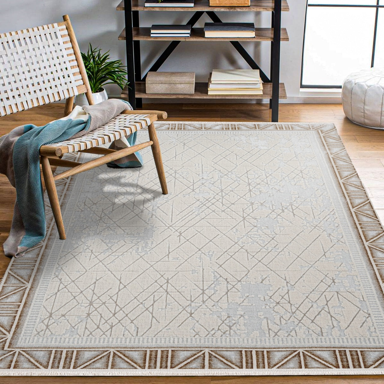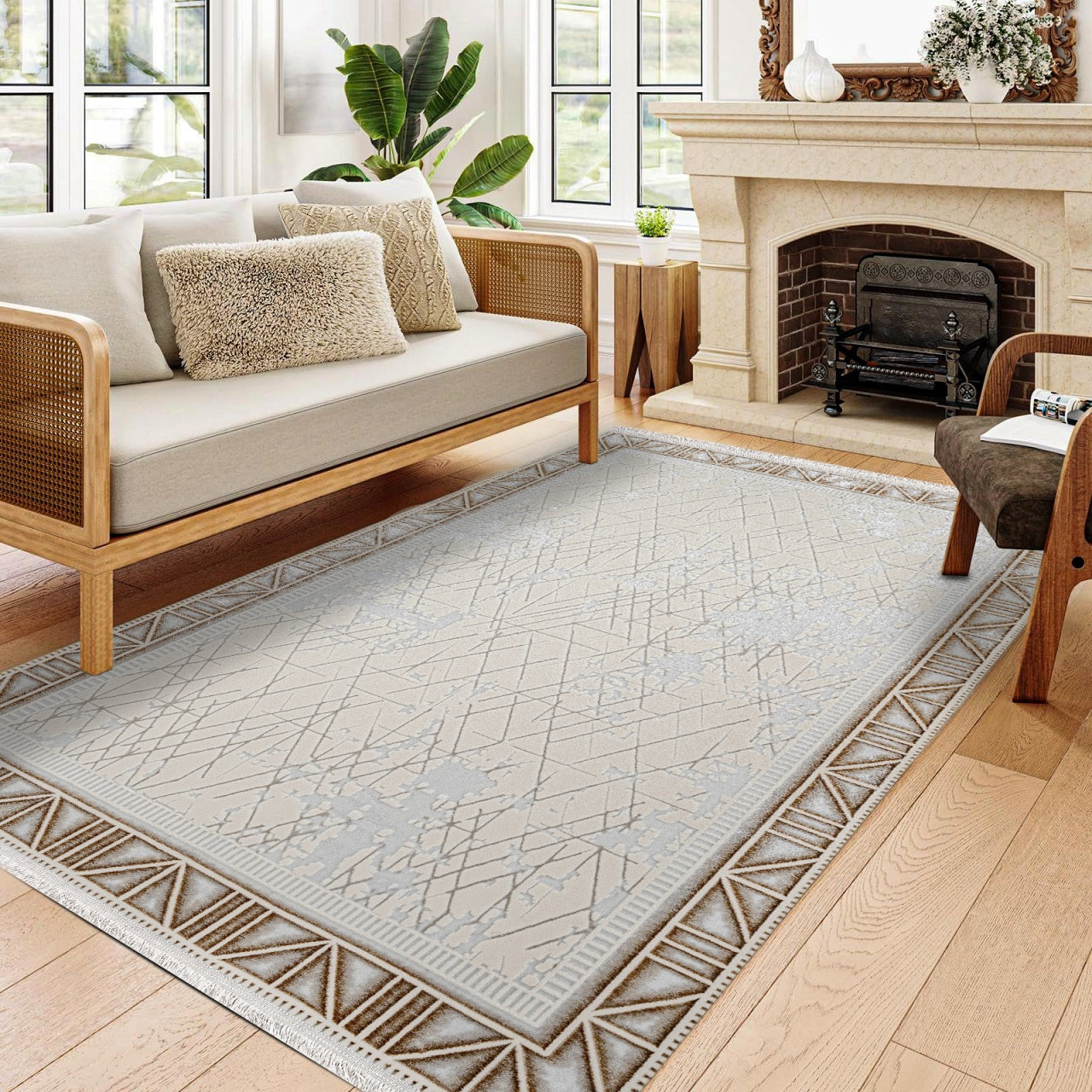 Emerie Beyaz Çerçeveli Polyester Makine Halısı