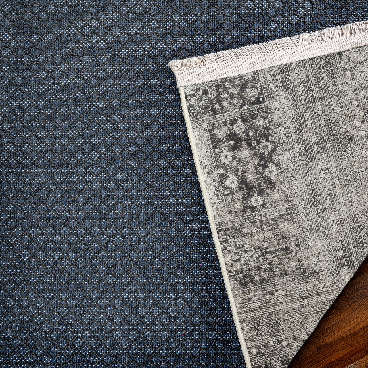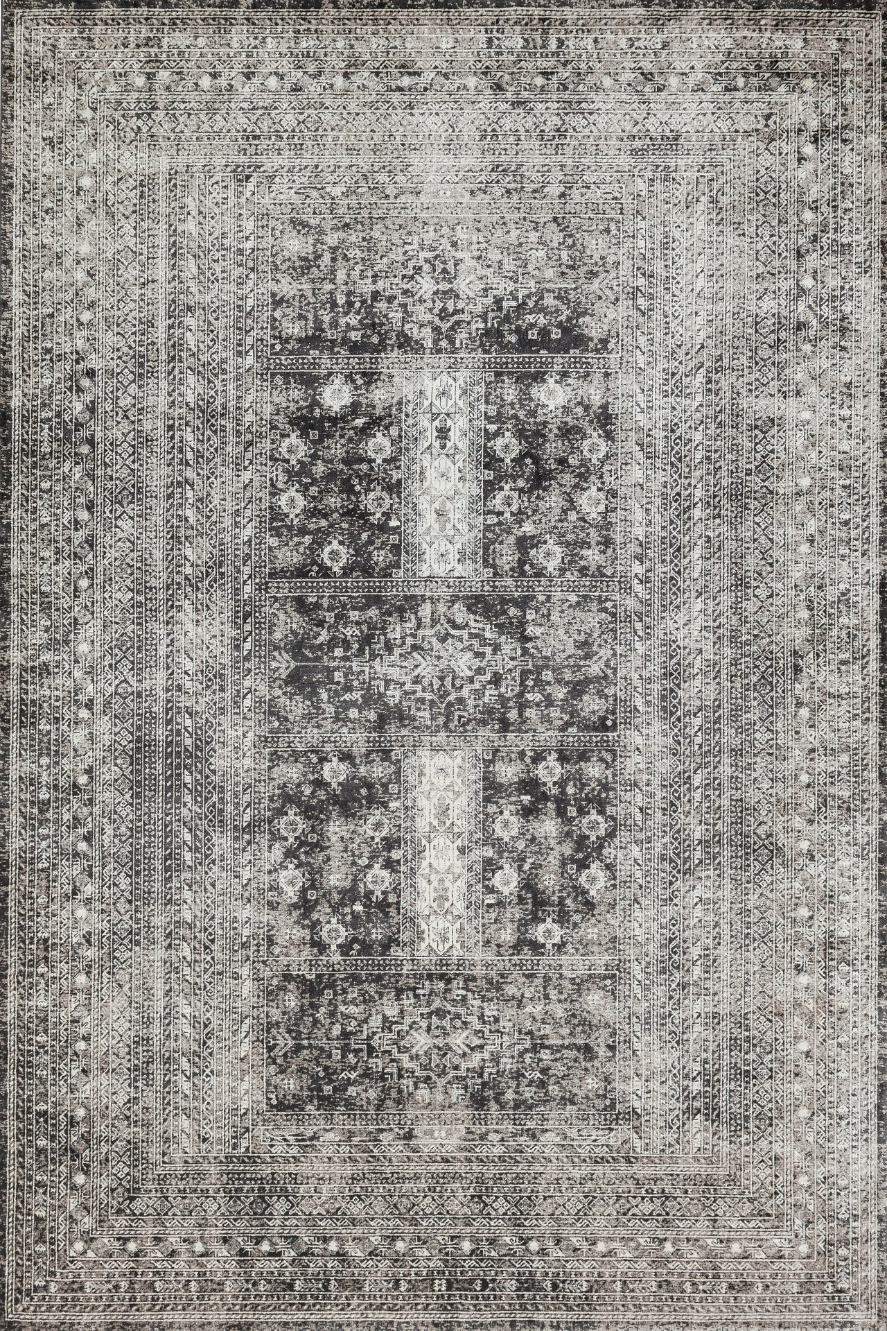 Antrasit Çerçeveli Modern Etnik Desenli Halı | Makinada Yıkanabilir | Hav Toz Vermez | Leke Tutmayan | Kaymaz Taban | Dijital Makine Baskı | Salon Yolluk Mutfak Halısı