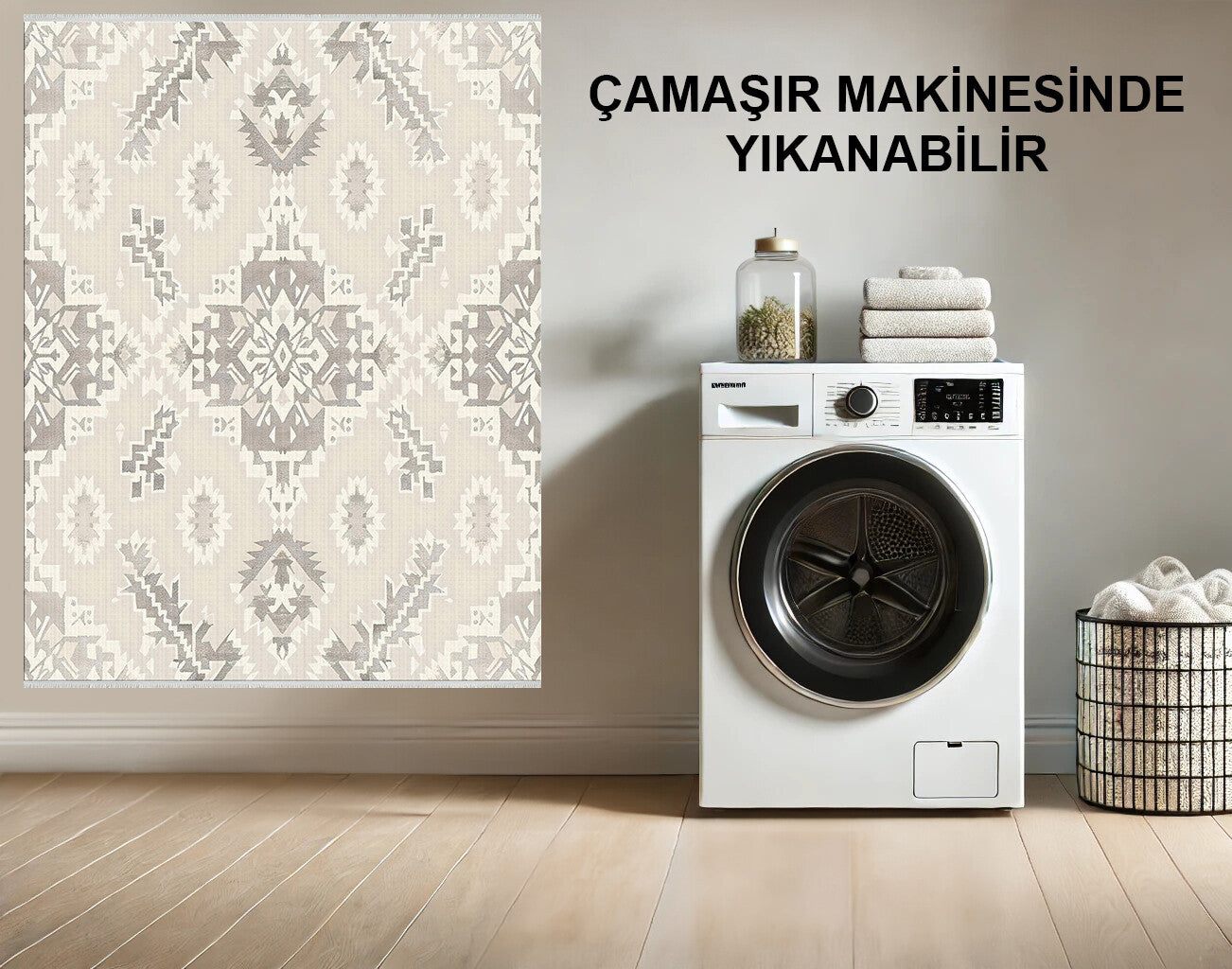 HALINET Bej ve Fildişi Geometrik İkat Yıkanabilir Halı her zevke uygunluğu ile evlerinize şıklık katacaktır.