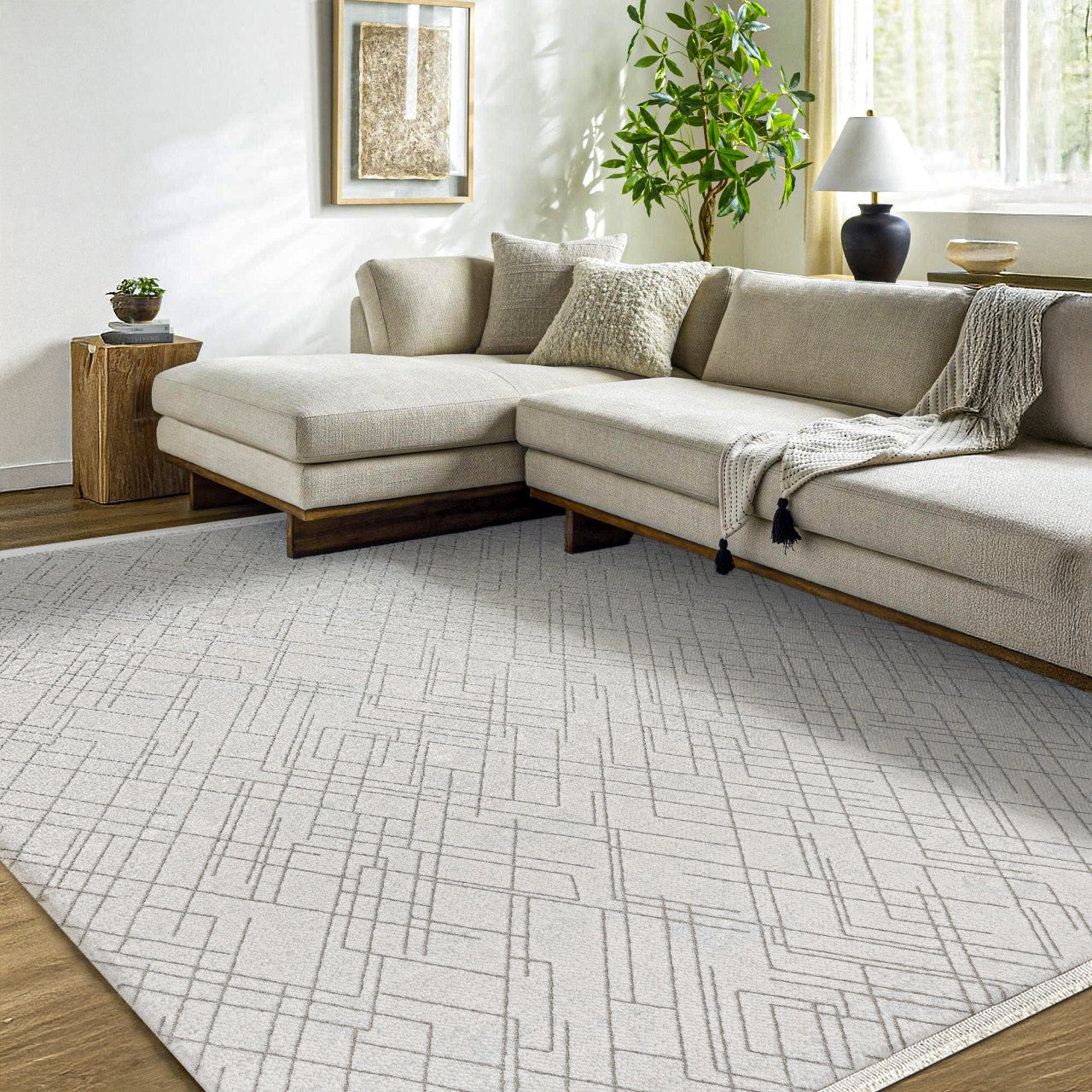 Edena Krem Geometrik Mikrofiber Polyester Makine Alan Halısı