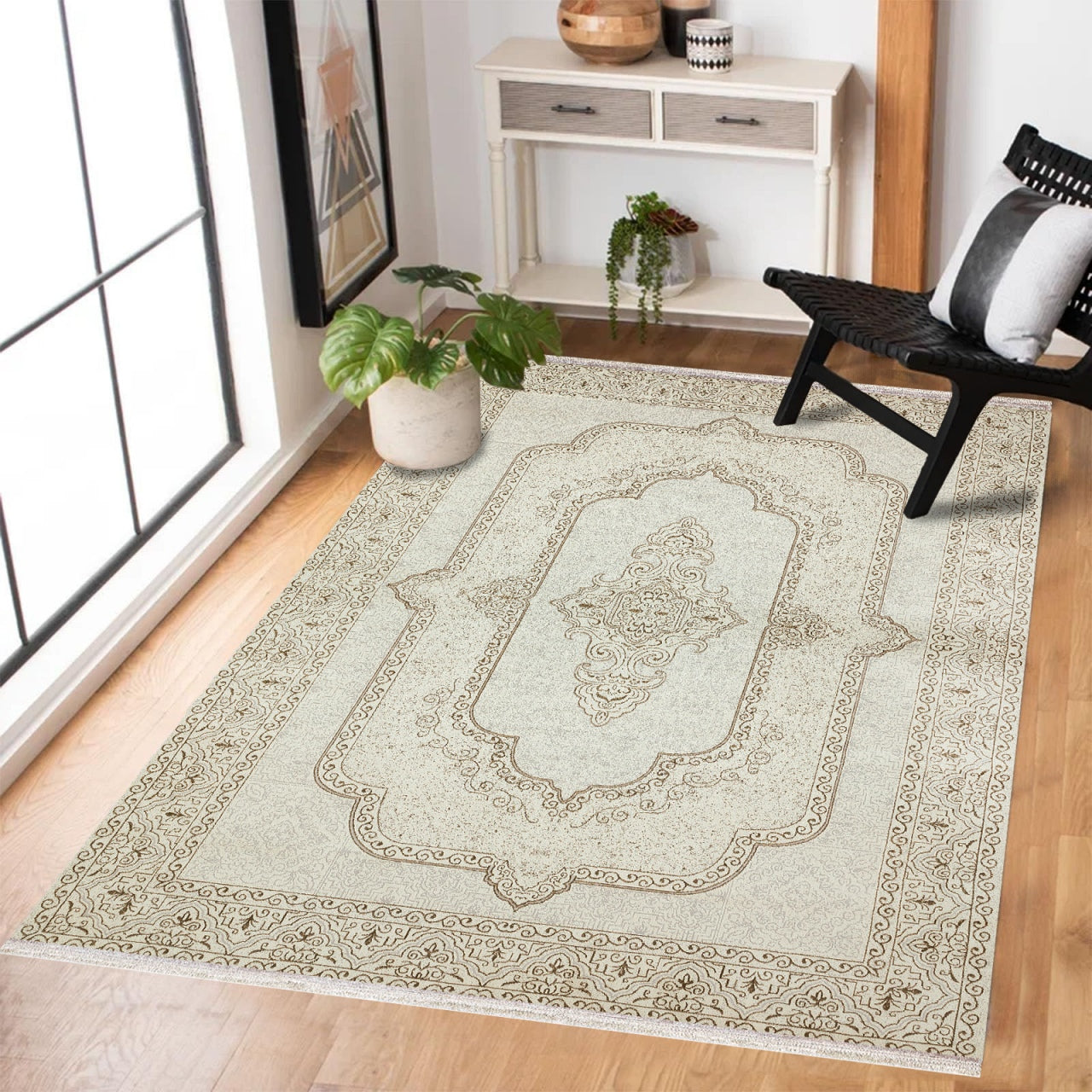 Krem Göbekli Modern Etnik Desenli Halı