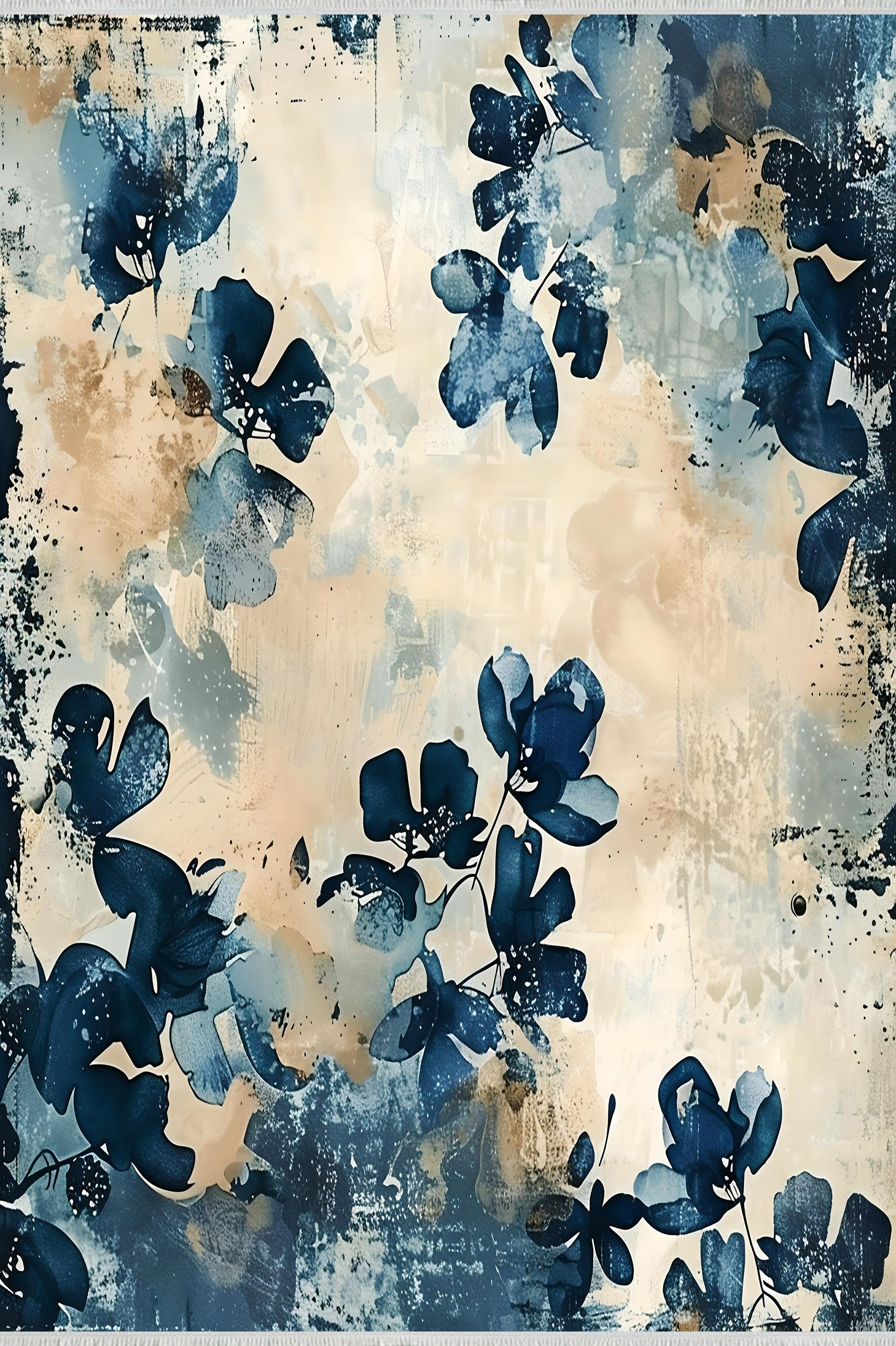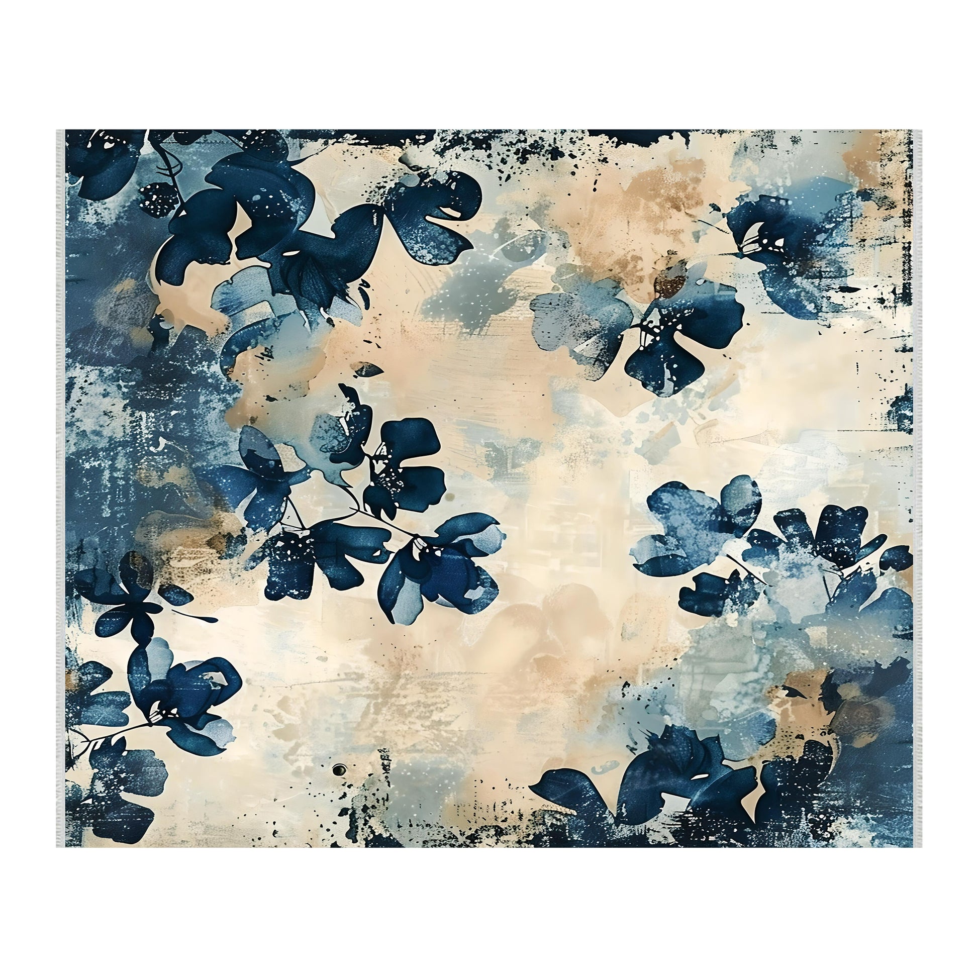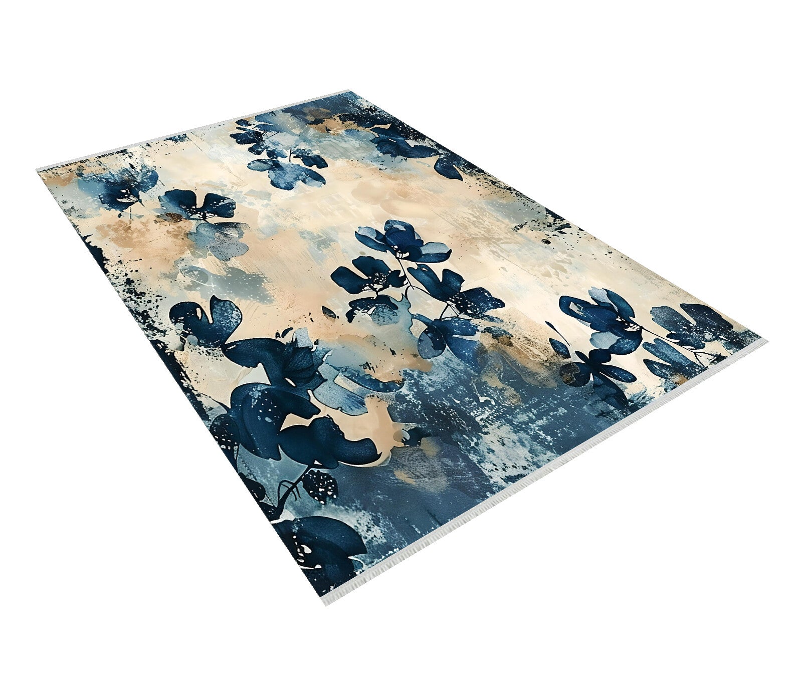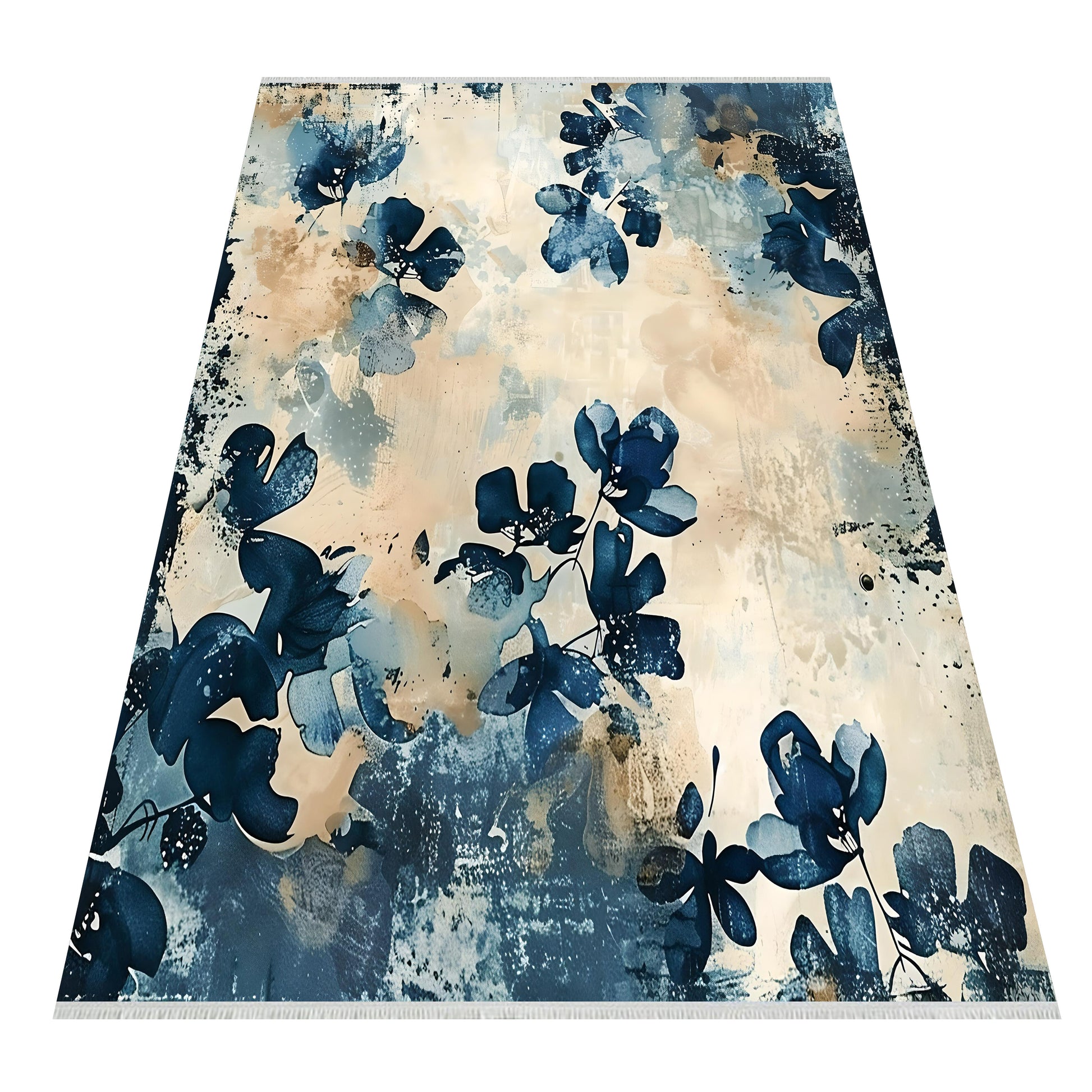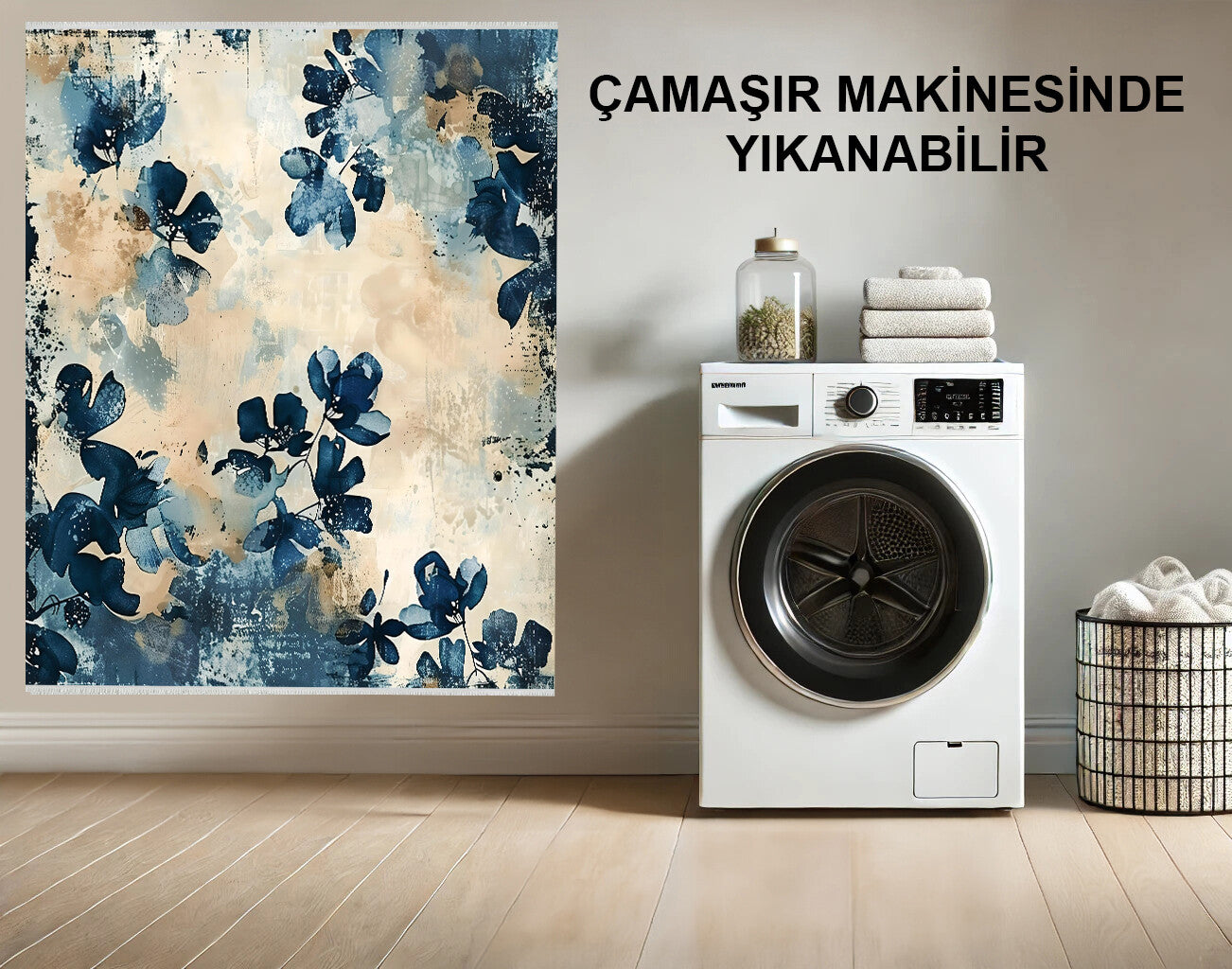 Turkuaz ve Bej Çiçekli Halı - Makinede Yıkanabilir Pamuklu Taban