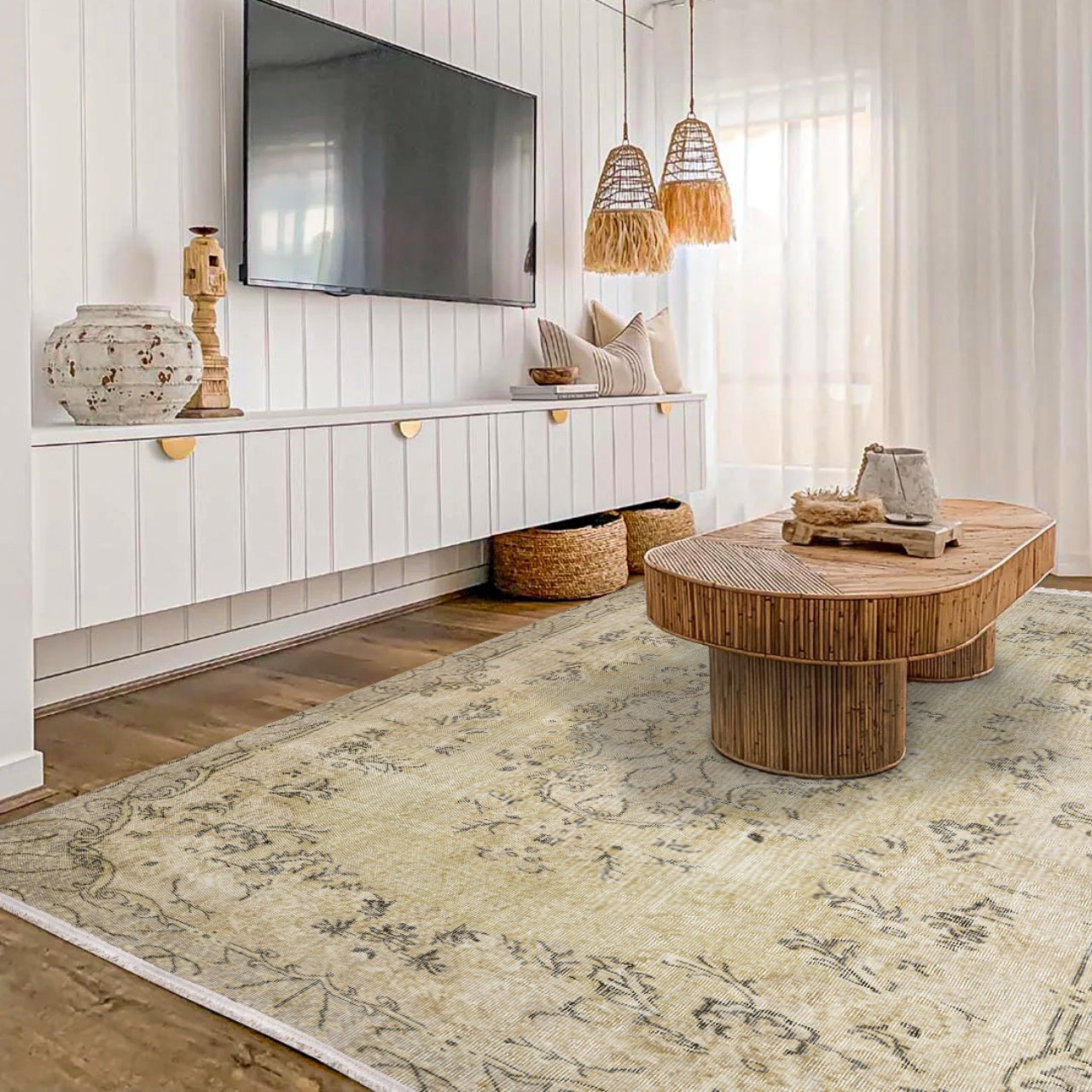 Vintage Bej Göbekli Yün ve Pamuk El Dokuma Halı 177x301