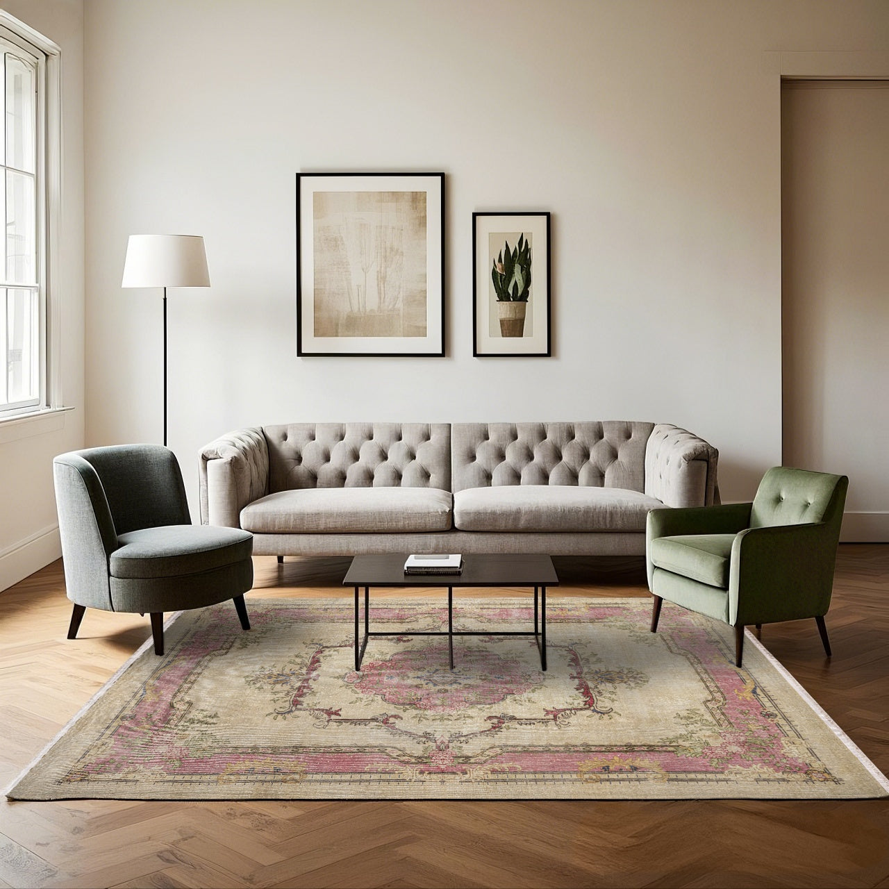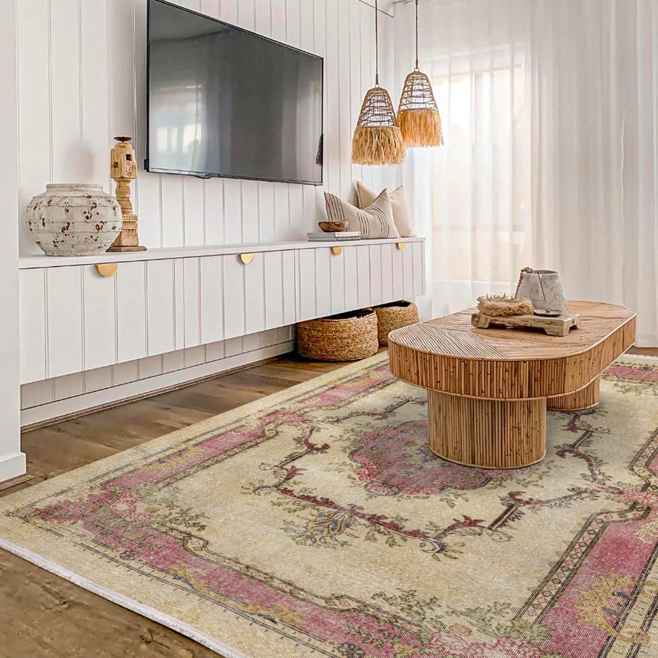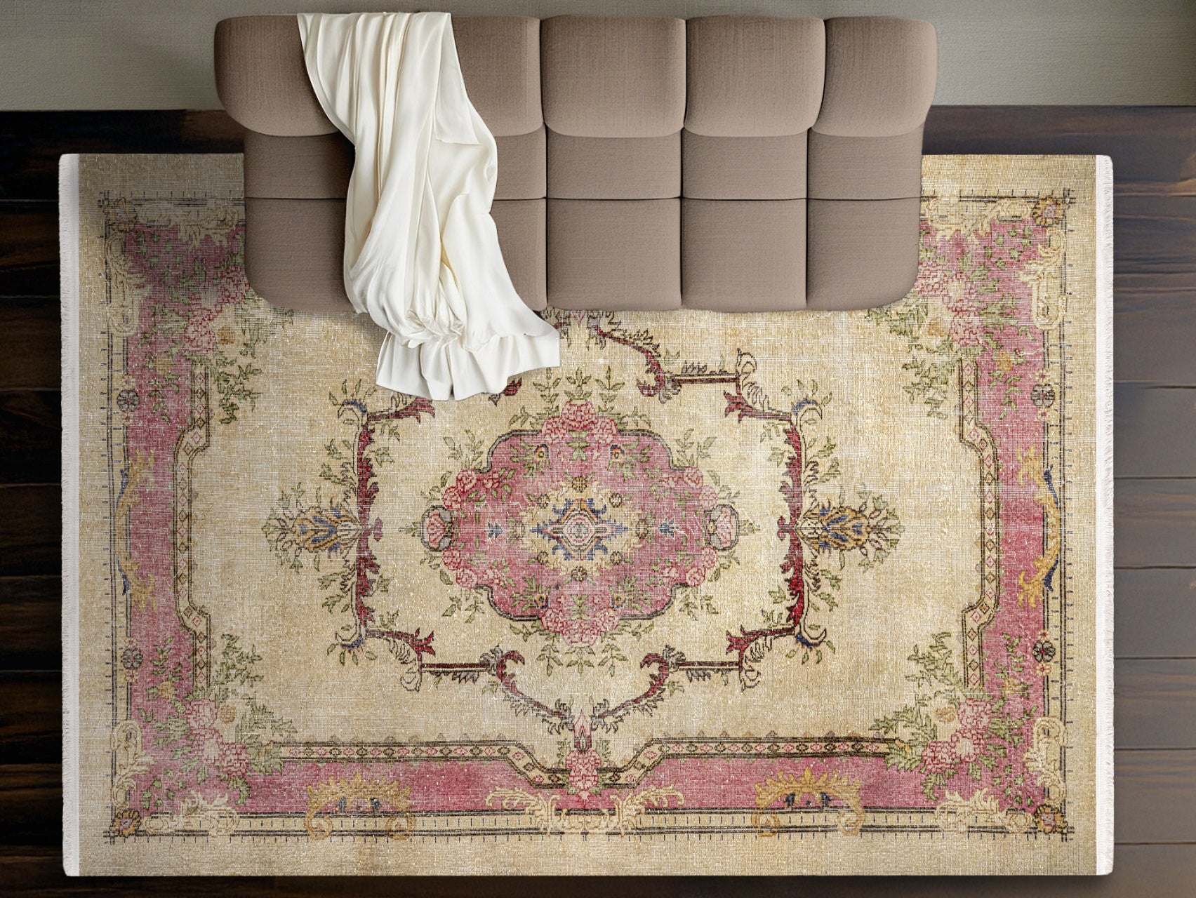 Vintage Bej Göbekli Yün ve Pamuk El Dokuma Halı 210x315