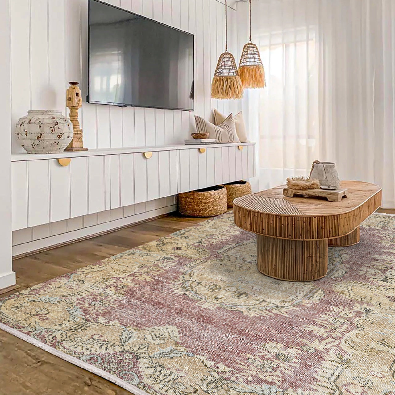 Vintage Pembe Göbekli Yün ve Pamuk El Dokuma Halı 204x305