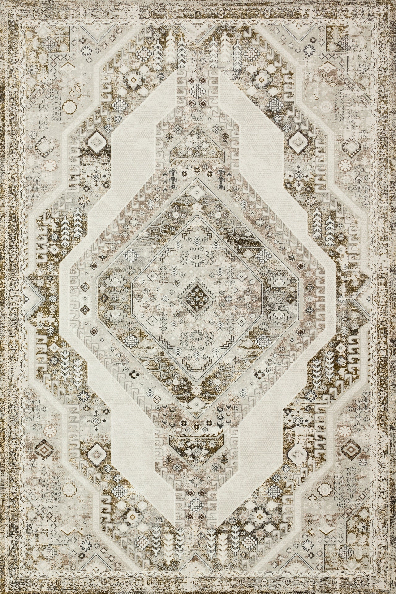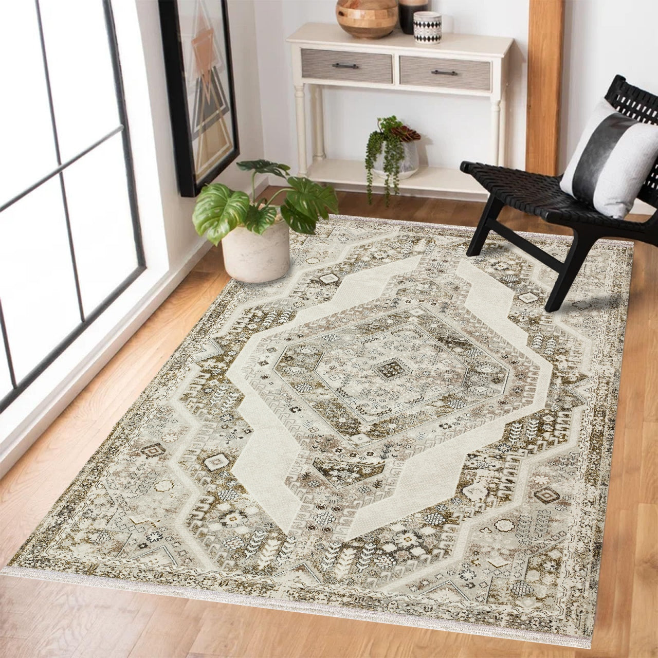 Bej Göbekli Modern Etnik Desenli Halı | Makinada Yıkanabilir | Hav Toz Vermez | Leke Tutmayan | Kaymaz Taban | Dijital Makine Baskı | Salon Yolluk Mutfak Halısı