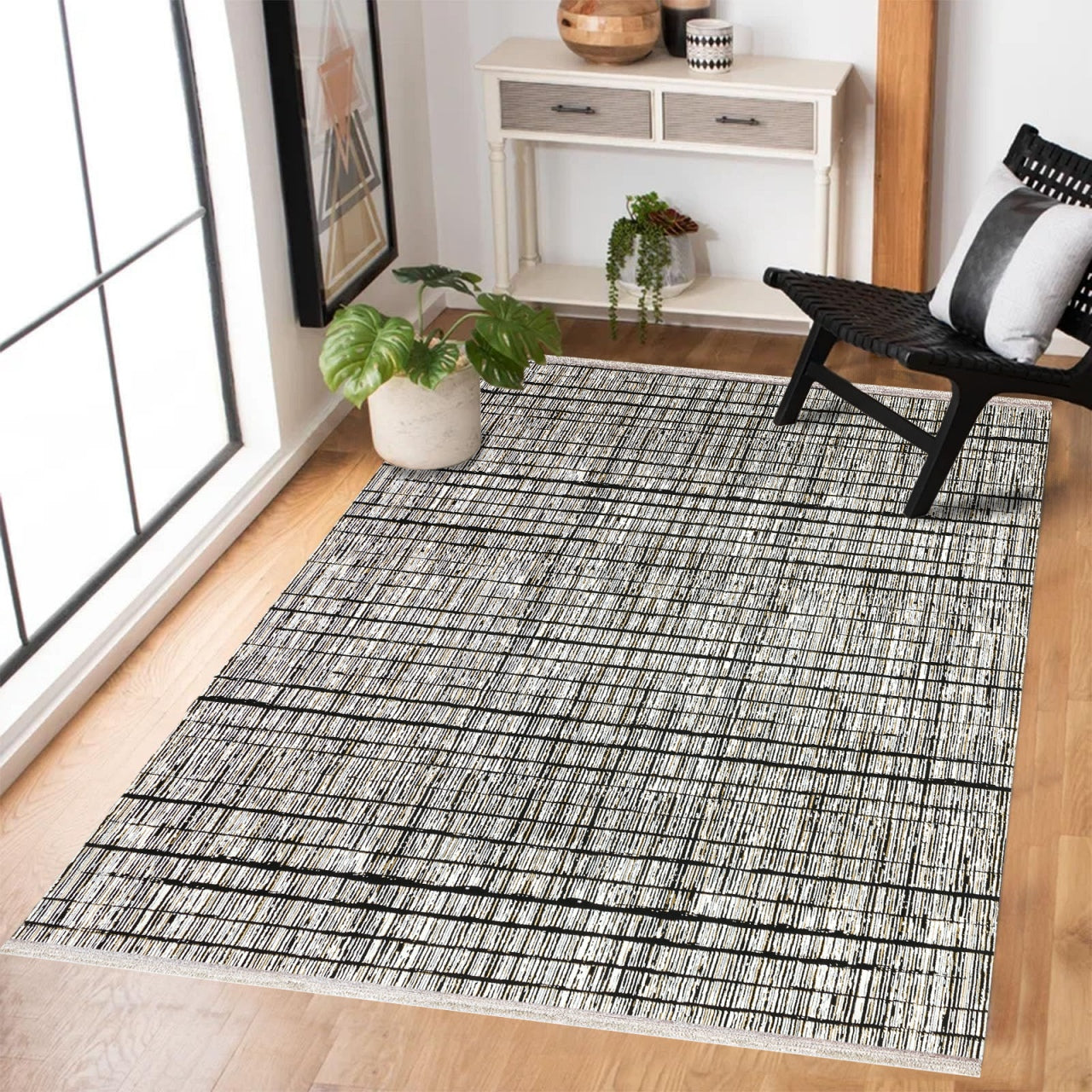 Siyah Soyut Modern Etnik Desenli Halı | Makinada Yıkanabilir | Hav Toz Vermez | Leke Tutmayan | Kaymaz Taban | Dijital Makine Baskı | Salon Yolluk Mutfak Halısı