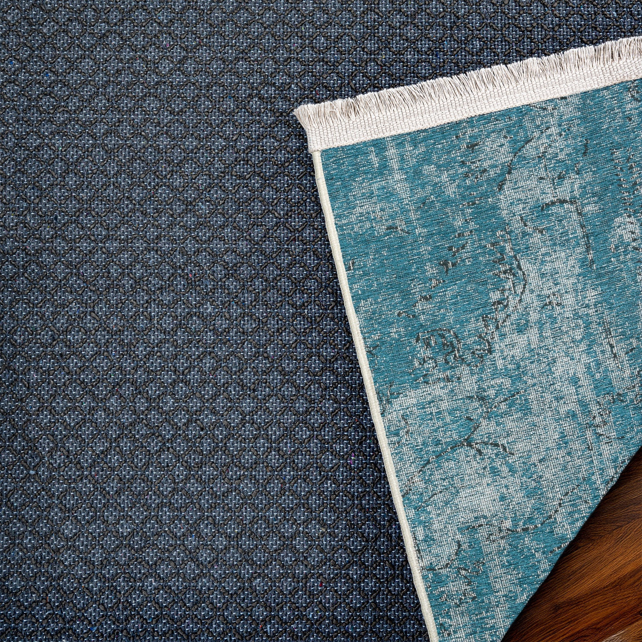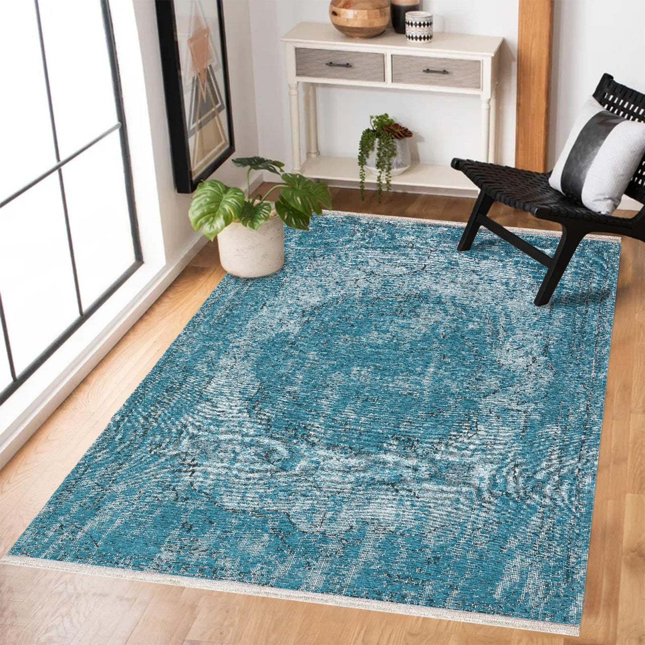 Mavi Göbekli Modern Etnik Desenli Halı | Makinada Yıkanabilir | Hav Toz Vermez | Leke Tutmayan | Kaymaz Taban | Dijital Makine Baskı | Salon Yolluk Mutfak Halısı