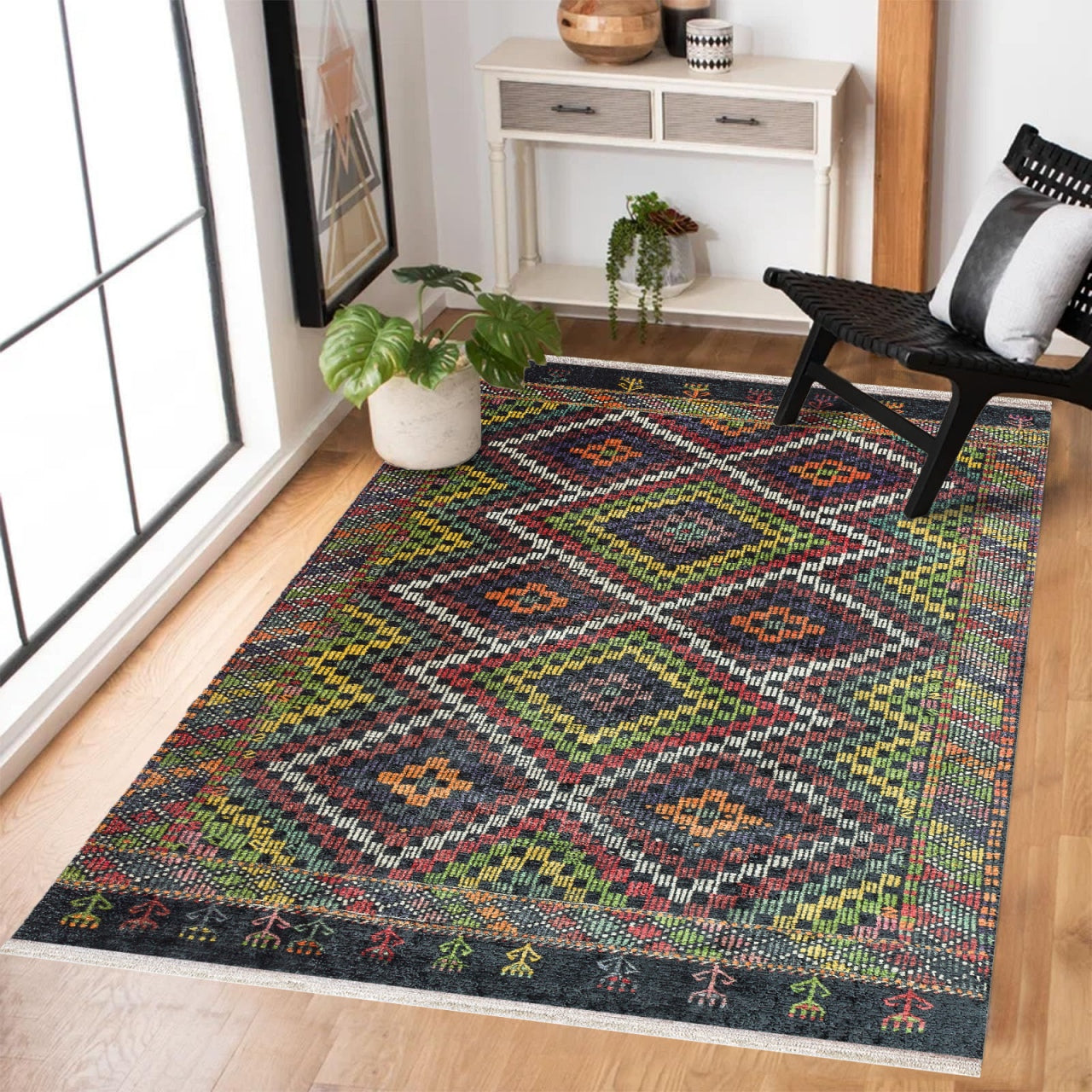 Siyah Geometrik Modern Etnik Desenli Halı | Makinada Yıkanabilir | Hav Toz Vermez | Leke Tutmayan | Kaymaz Taban | Dijital Makine Baskı | Salon Yolluk Mutfak Halısı